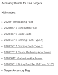 Kit includes: 202041119 Beading Foot 202040015 Blind Stitch Foot 202038010 Cloth Guide 202034016 Cording Foot (Type A) 202035017 Cording Foot (Type B) 202037019 Elastic Gathering Attachment 202036111 Gathering Attachment 202039011 Piping Foot Set (1/8? and 3/16?) Serger Accessory Bag