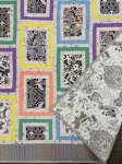 Finished shop sample, Tula Pink "Snapshot" quilt. Featuring fabrics from her Lineworks collection (2020), out of print. Backed with Sketchyr, from the same collection. This quilt is 100% Tula!Measures 58" X 72"